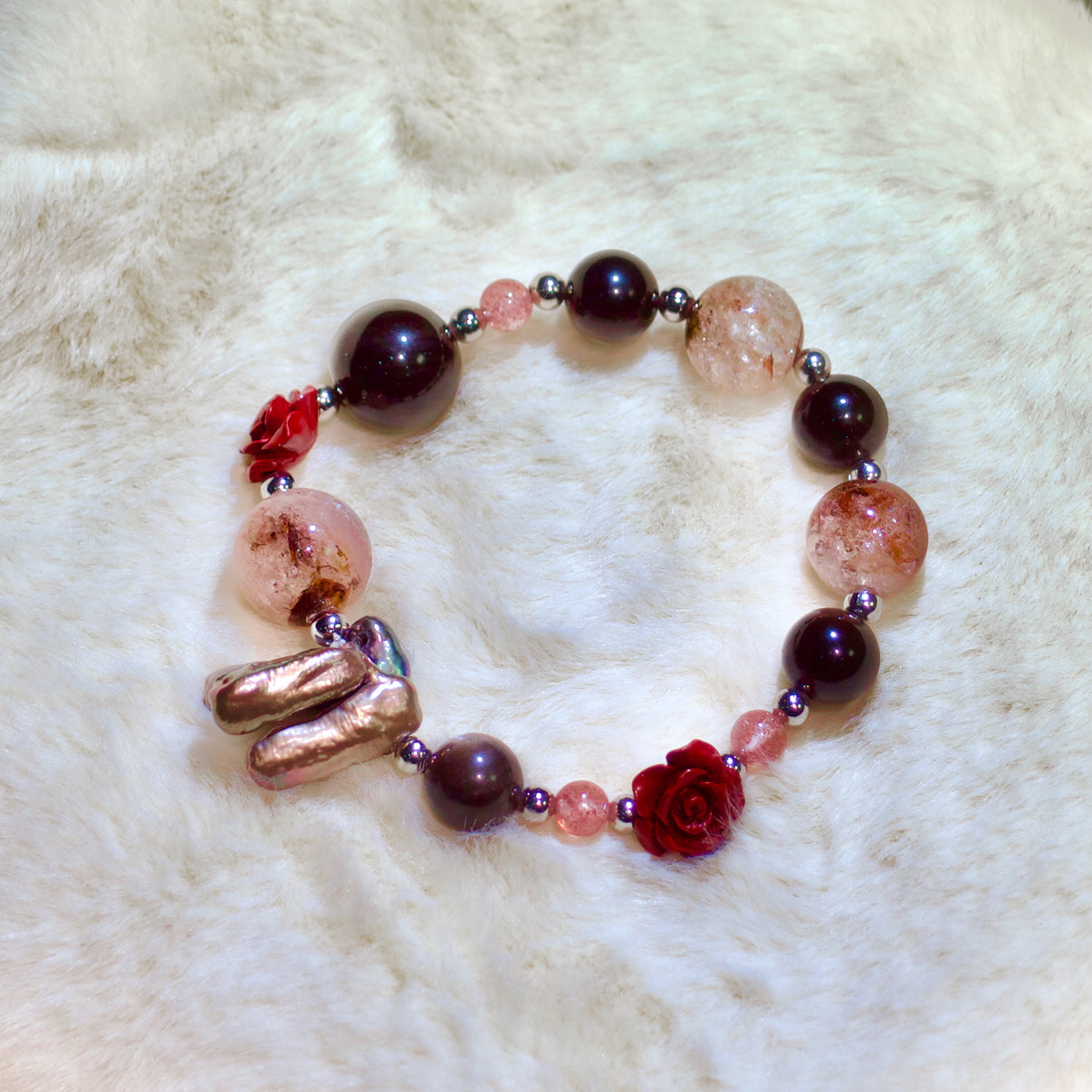 Crafted with silver sheen obsidian, ice-clear resin flowers, strawberry quartz, silver-plated copper beads, and baroque black pearls, this piece balances softness and edge in a restrained, poetic form.