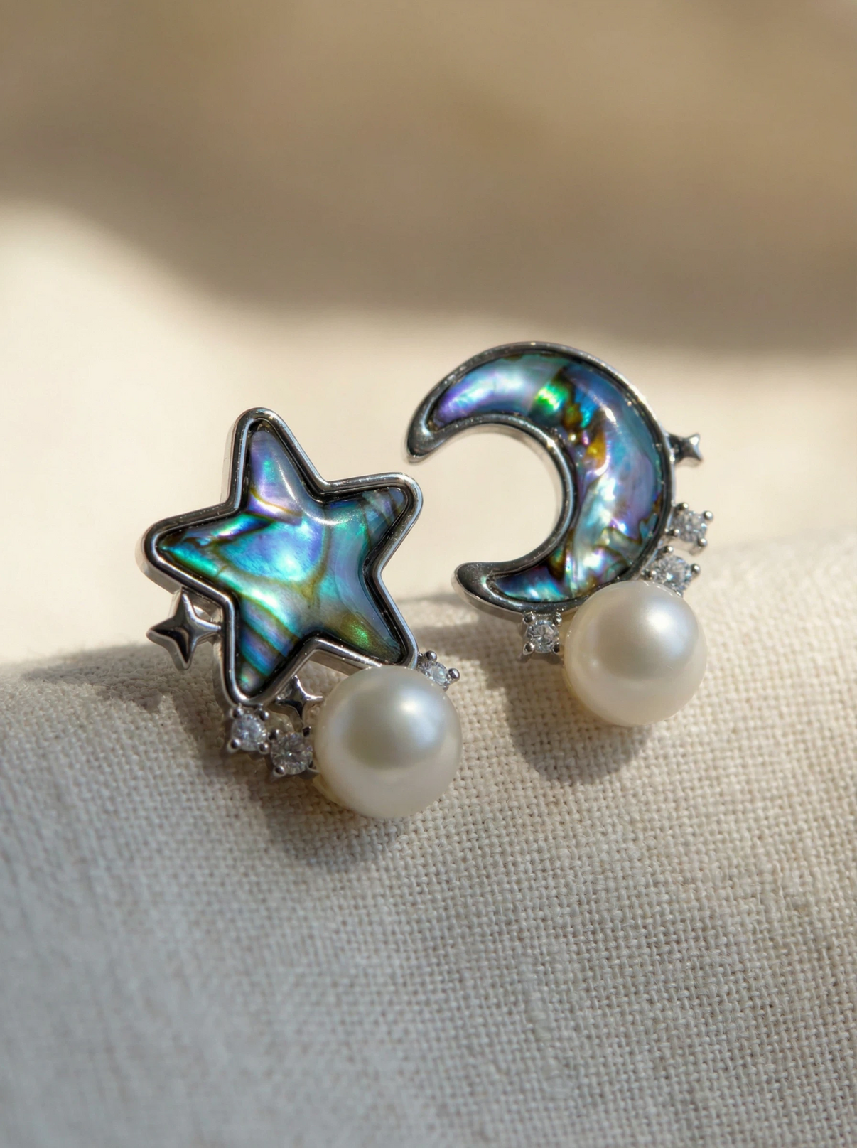 Shaped from natural abalone shell, the star and crescent moon shimmer with shifting hues, revealing different colors as light moves — like a dream that never stays the same.